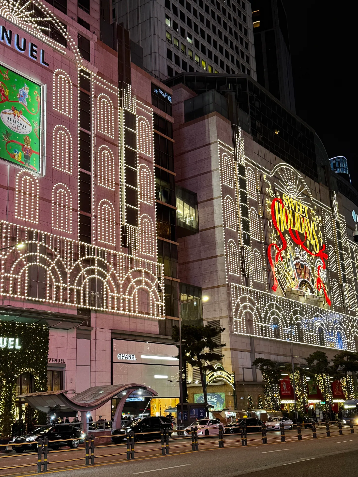 In December the entire place glows. Lights strung across streets, that Mariah Carey song greeting you in every doorway. Teenagers roaming in clusters, laughing into the cold. The chaos feels polite. Seoul does not overwhelm, it invites.